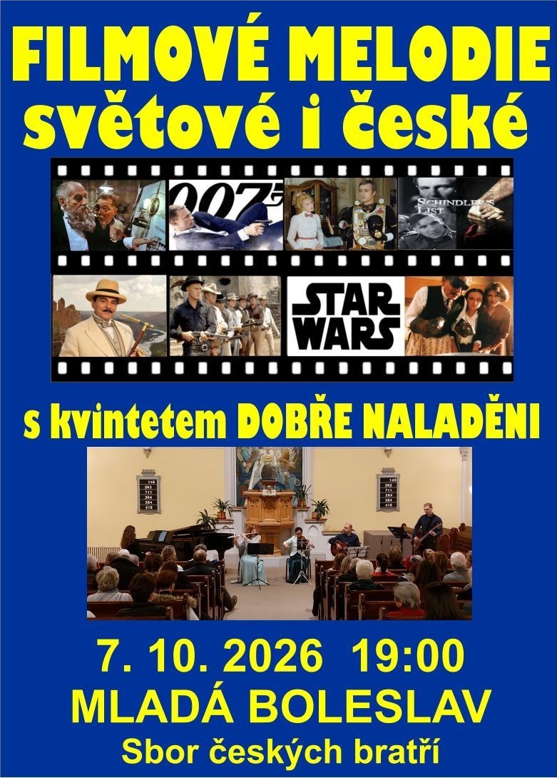 V sále Sboru českých bratřích pro Vás přípravujeme koncert, kde na vás čekají zbrusu nové aranže světových i českých filmových melodií v podání Kvinteta Dobře naladěni v krásném Sboru českých bratří.